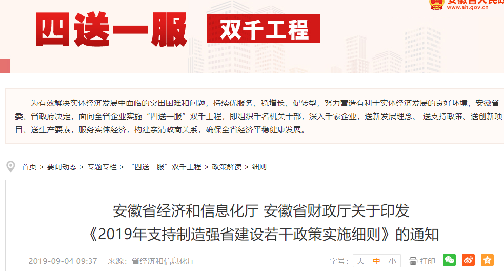 安徽省印發(fā)《關于印發(fā)支持制造強省建設若干政策的通知》,對獲得國家智能制造試點示范項目的企業(yè)給予一次性獎補200萬元。 此外,經省認定的智能工廠、數(shù)字化車間,分別給予企業(yè)一次性獎補100萬元、50萬元;對通過國家信息化和工業(yè)化融合管理體系標準評定的企業(yè)給予一次性獎補50萬元;對年度購置10臺及以上工業(yè)機器人(自由度≥4)的企業(yè),按購置金額的20%給予一次性獎補。
